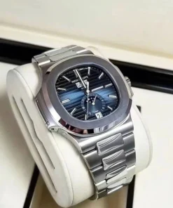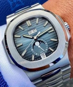 The steel Nautilus, endowed with an Annual Calendar and moon-phase display, now features a new blue dial inspired from the dial color of the original Nautilus model of 1976.