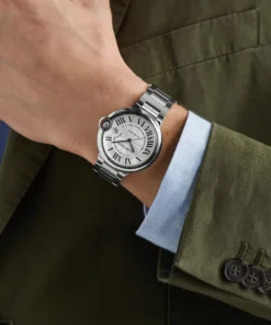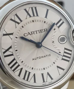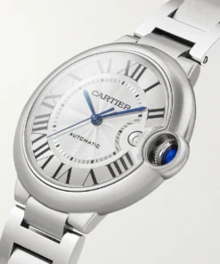 Ballon Bleu de Cartier watch, 40 mm, mechanical manufacture movement with automatic winding, caliber 1847 MC. Steel case, fluted crown set with a synthetic spinel cabochon, silvered guilloch?? dial, blued-steel sword-shaped hands, sapphire crystal, stainless steel interchangeable bracelet, 3 o’clock There is a calendar window at the clock position. Thickness: 12.4mm. Water-resistant to 3 bar (approx. 30 meters/100 feet).