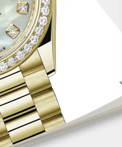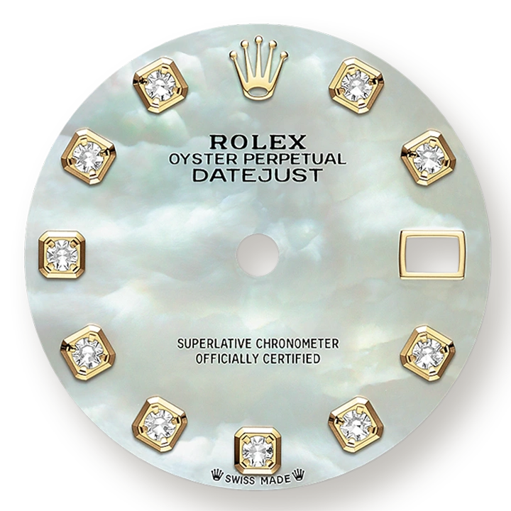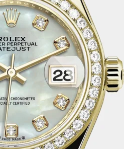 The light reflections on the case sides and lugs highlight the elegant profile of the?28 mm Oyster case, which is fitted with a diamond-set bezel. Rolex’s classic feminine watch, the Lady-Datejust is in the lineage of the Datejust, the emblematic model that has been a byword for style and accurate timekeeping.