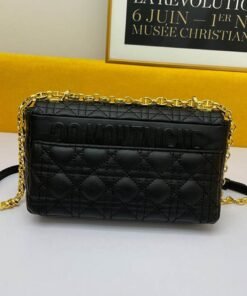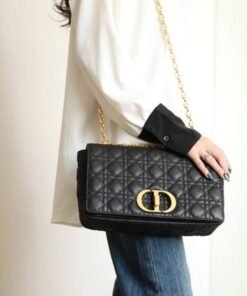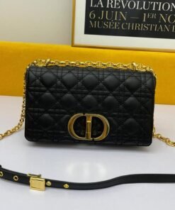 The new Dior Caro handbag is decorated with Cannage pattern stitching on black calfskin, showing a unique stitching texture. The flap of this soft bag is equipped with a retro gold-toned metal rotating “CD” lock. The design is inspired by the unique closure of the Christian Dior perfume bottle. The detachable iconic “CD” link shoulder strap can be replaced with a wide embroidered shoulder strap, allowing you to create an elegant and fashionable look regardless of occasion, morning or evening.