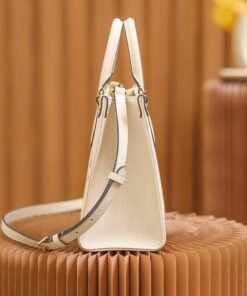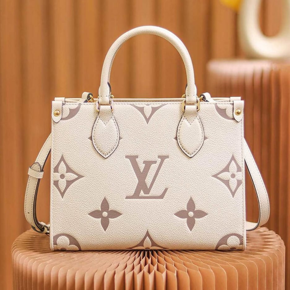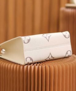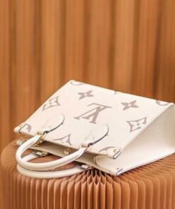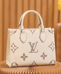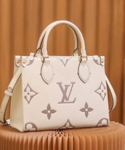 Inspired by Louis Vuitton??s famous Sac Plat from 1968, the Onthego PM tote is fashioned in Monogram Empreinte leather, embossed with a Giant Bicolor Monogram pattern. This smaller version of the original Onthego fits essentials such as an iPad Mini. Articulated top handles and an adjustable removable strap offer a variety of carry options.