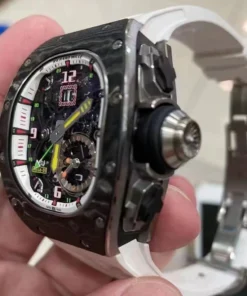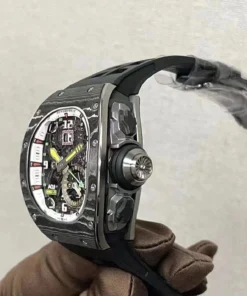 The caseback and bezel are comprised of a first bezel in polished and satin-finished grade 5 titanium, to which is affixed a second bezel, just 1.80 mm in thickness, machined from Carbon TPT?. This high-tech material is made up of 600 layers of parallel filaments obtained by separating out carbon fibres. The layers, no more than 30 microns thick, are impregnated with a black resin. They are then assembled on a dedicated machine, which stacks the layers, varying the orientation of the fibres by 45?? between layers. The composite is then hardened heated to 120??C at a pressure of 6 bars in a kiln similar to that used for the production of aeronautics parts, after which it is ready to be machined at Richard Mille. During this phase, the many layers of Carbon TPT? are revealed, creating random damascene patterns that make each piece unique.
