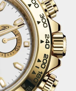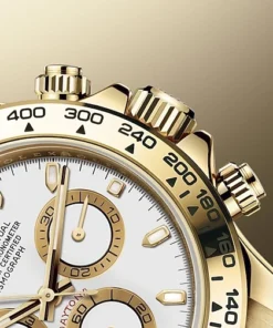 THIS OYSTER PERPETUAL COSMOGRAPH DAYTONA IN 18 KT YELLOW GOLD, WITH A WHITE DIAL AND AN OYSTER BRACELET, FEATURES 18 KT YELLOW GOLD BEZEL WITH ENGRAVED TACHYMETRIC SCALE.