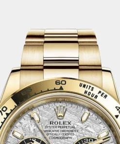 THIS OYSTER PERPETUAL COSMOGRAPH DAYTONA IN 18 KT YELLOW GOLD, WITH A METEORITE AND BLACK DIAL AND AN OYSTER BRACELET, FEATURES 18 KT YELLOW GOLD BEZEL WITH ENGRAVED TACHYMETRIC SCALE.