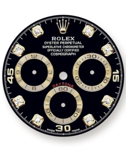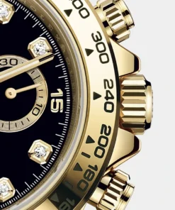 THIS OYSTER PERPETUAL COSMOGRAPH DAYTONA IN 18 KT YELLOW GOLD, WITH A BLACK, DIAMOND-SET DIAL AND AN OYSTER BRACELET, FEATURES 18 KT YELLOW GOLD BEZEL WITH ENGRAVED TACHYMETRIC SCALE.