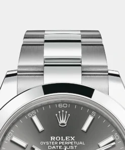 THIS OYSTER PERPETUAL DATEJUST 41 IN OYSTERSTEEL FEATURES A SLATE DIAL AND AN OYSTER BRACELET.