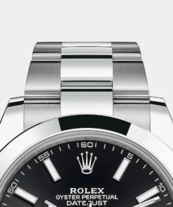 THIS OYSTER PERPETUAL DATEJUST 41 IN OYSTERSTEEL FEATURES A BRIGHT BLACK DIAL AND AN OYSTER BRACELET.