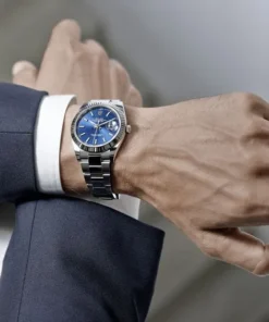 This Oyster Perpetual Datejust 41 in Oystersteel and white gold features a bright blue dial and an Oyster bracelet.