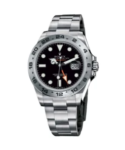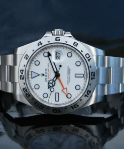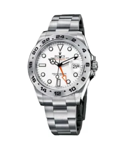 This Oyster Perpetual Explorer II in Oystersteel with an Oyster bracelet features a white dial with an arrow-shaped 24-hour hand and hour markers with a Chromalight display.