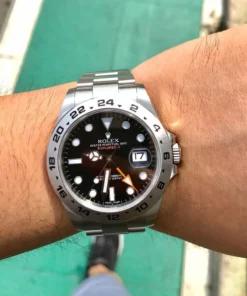 The Explorer II is equipped with an additional 24-hour display; a dedicated hand circles the dial in 24 hours rather than the usual 12, pointing to a fixed bezel with 24 hour graduations.