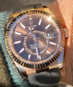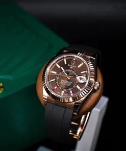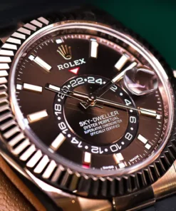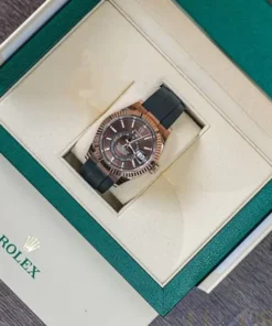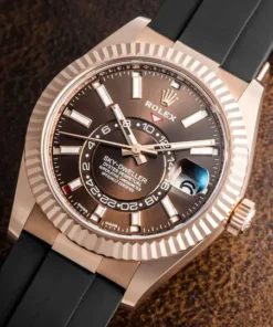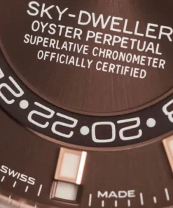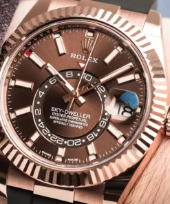 THE OYSTER PERPETUAL SKY-DWELLER IN 18 CT EVEROSE GOLD WITH A CHOCOLATE DIAL AND AN OYSTERFLEX BRACELET.