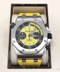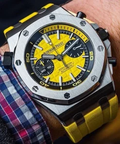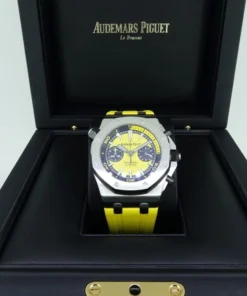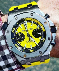 A summery bright yellow Oak Offshore. Blatant, refreshing, funky. Featuring the selfwinding Manufacture caliber 3124/3841 with a power reserve of 50 hours, 59 jewels and 21,600 vibrations/hour fitted into a 42 mm stainless steel case with sapphire crystal open caseback.