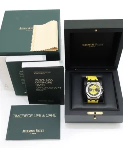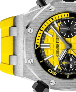 Yellow dial with ??M??ga Tapisserie?? pattern, black counters, blackened gold applied hour-markers and Royal Oak hands with luminescent coating, black rotating inner bezel with diving scale and zone from 60 to 15 minutes in yellow.