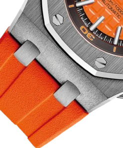 Orange dial with ??M??ga Tapisserie?? pattern, black counters, blackened gold applied hour-markers and Royal Oak hands with luminescent coating, black rotating inner bezel with diving scale and zone from 60 to 15 minutes in orange.