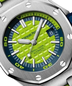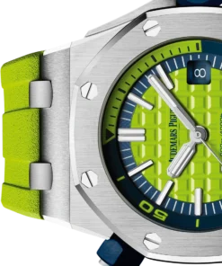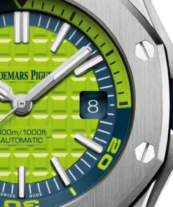 Green dial with ??M??ga Tapisserie?? pattern, white gold applied hour-markers and Royal Oak hands with luminescent coating, blue rotating inner bezel with diving scale and zone from 60 to 15 minutes in yellow green.
