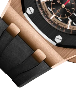 18-carat pink gold case, glareproofed sapphire crystal and caseback, black ceramic bezel, pushpieces and screw-locked crown, pink gold pushpiece guards.
