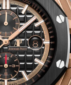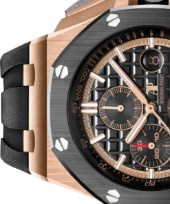 Black dial with ??M??ga Tapisserie?? pattern, black counters, pink gold applied hour-markers and Royal Oak hands with luminescent coating, black inner bezel.