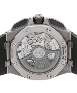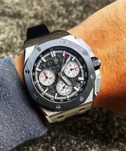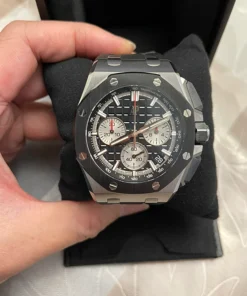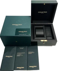 Black dial with ??M??ga Tapisserie?? pattern, rhodium-toned counters and external zone, white gold applied hour-markers and Royal?Oak hands with luminescent coating, black inner bezel