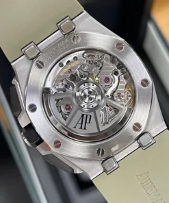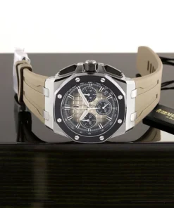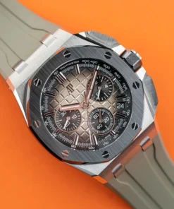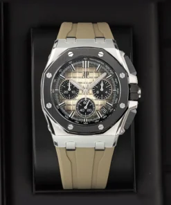 Smoked light brown dial with ??M??ga Tapisserie?? pattern, black counters and external zone, white gold applied hour-markers, white gold Royal?Oak hands with luminescent coating, black inner bezel