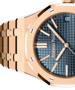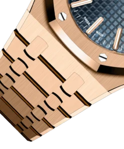 This 18-carat pink gold 41 mm Royal Oak Selfwinding is enriched with a Grande Tapisserie dial in the iconic Bleu Nuit, Nuage 50 shade of the 1972 model. It also showcases the collection??s new design evolution.