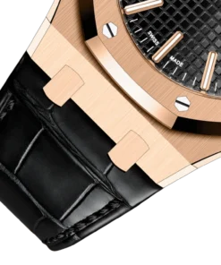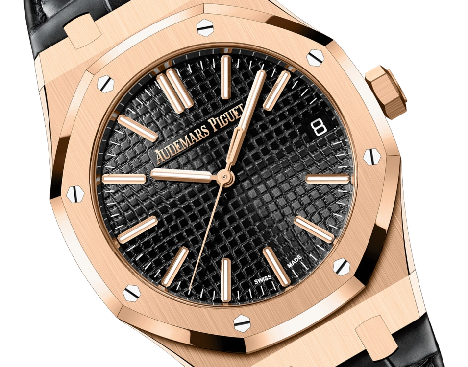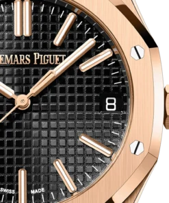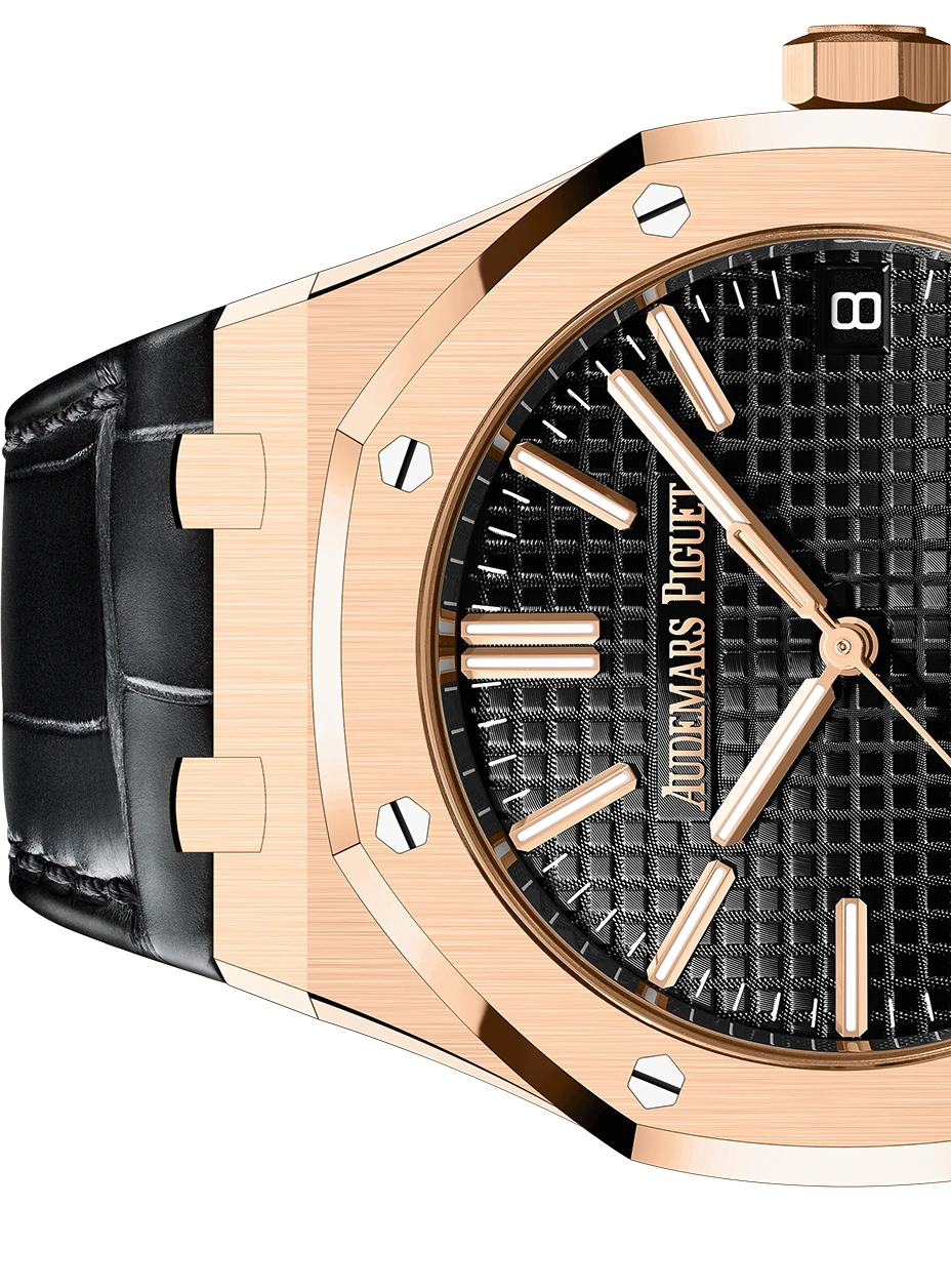 This 18-carat pink gold Royal Oak Selfwinding in 41 mm is endowed with the new design evolution and sports a black Grande Tapisserie dial and a matching alligator strap.