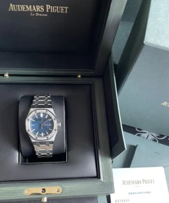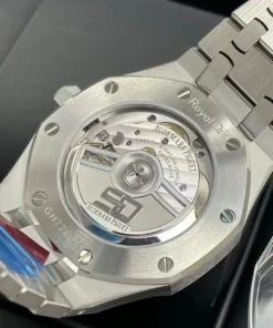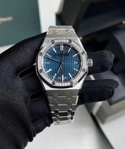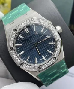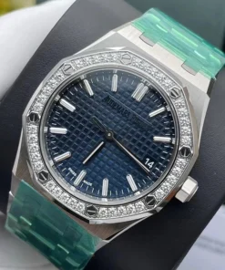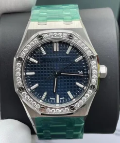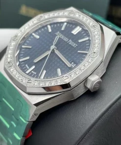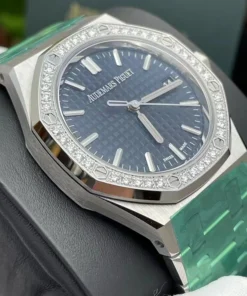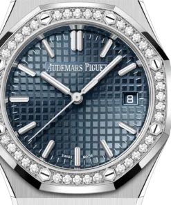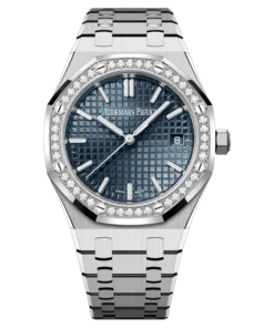 The 34 mm stainless steel anniversary model is illuminated by a Bleu Nuit, Nuage 50 Grande Tapisserie dial encircled by a diamond-set bezel. The piece also features the new Royal Oak design evolution and the rhodium-toned ??50-years?? oscillating weight.