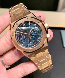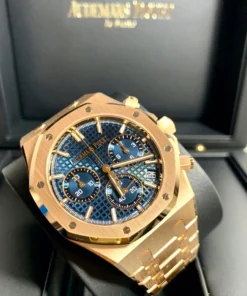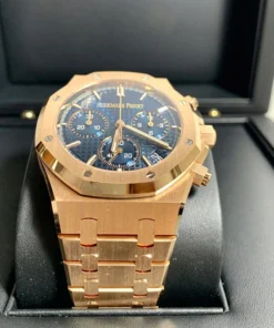The “Bleu Nuit, Nuage 50” ??Grande Tapisserie?? dial provides an elegant contrast with the 18-carat pink gold case and bracelet. This 41 mm Selfwinding Chronograph also benefits from the latest Royal Oak design evolution.