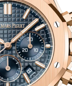 ??Bleu nuit nuage 50?? dial with ??Grande Tapisserie?? pattern, ??Bleu nuit nuage 50?? counters, pink gold applied hour-markers and Royal?Oak hands with luminescent coating.