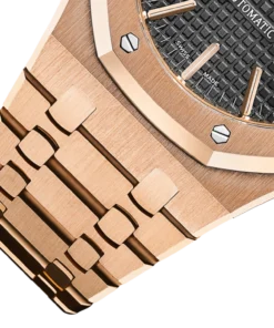 Black dial with ??Grande Tapisserie?? pattern, pink gold applied hour-markers and Royal Oak hands with luminescent coating