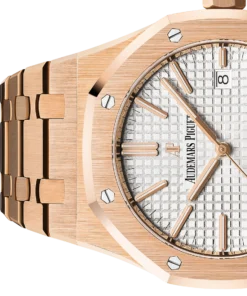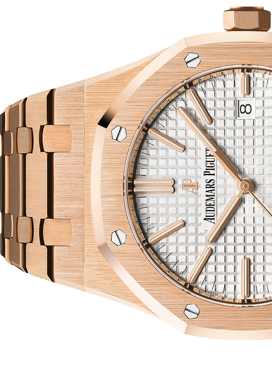 Silver-toned dial with ??Grande Tapisserie?? pattern, pink gold applied hour-markers and Royal Oak hands with luminescent coating
