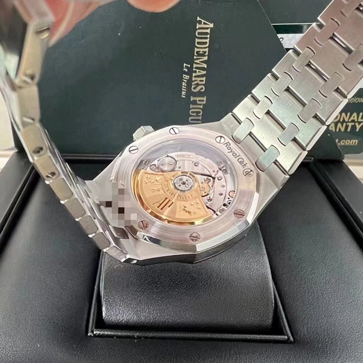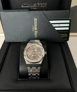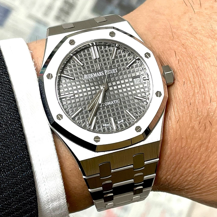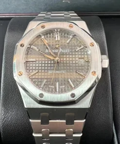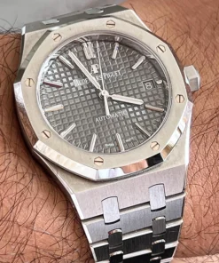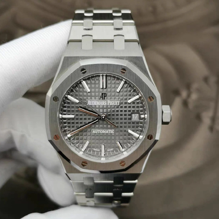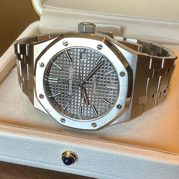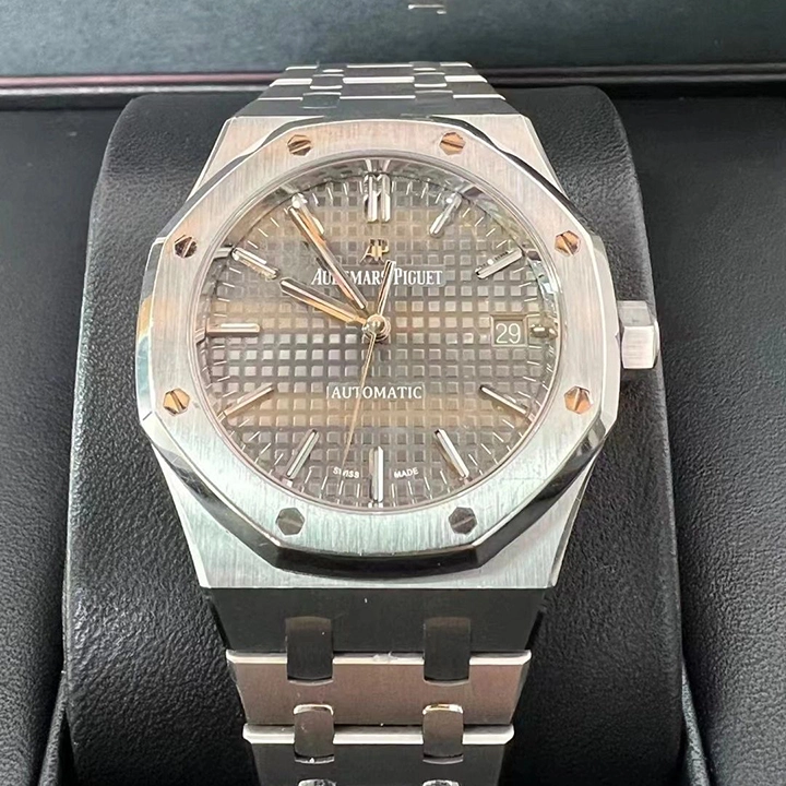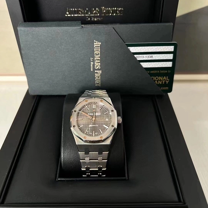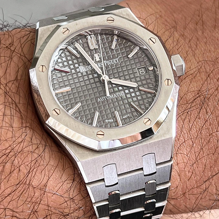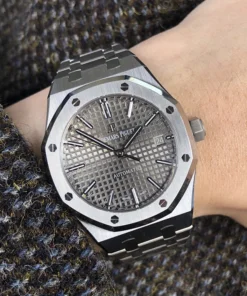Ruthenium-toned dial with ??Grande Tapisserie?? pattern, white gold applied hour-markers and Royal Oak hands with luminescent coating.