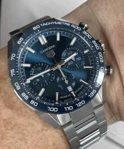 An elegant ceramic blue tachymeter fixed bezel, steel screw-down sapphire case back and pressure resistance to 100m, this watch stands up to anyone and anything.