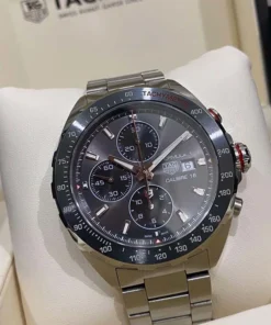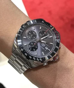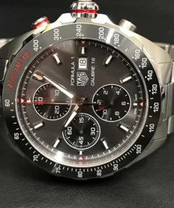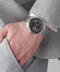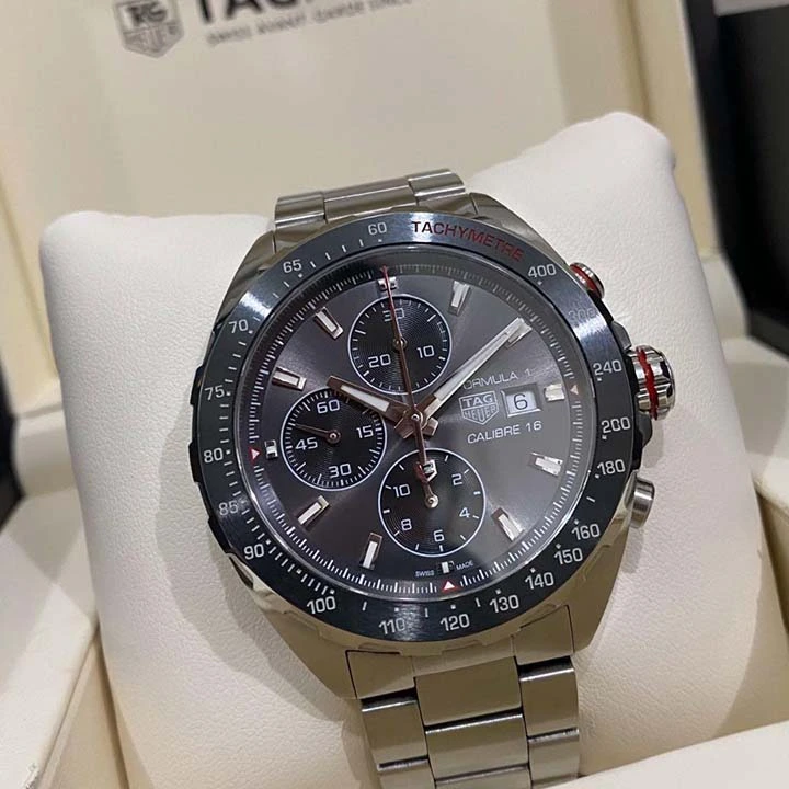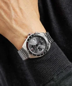 The sunray-brushed grey dial houses black azurage sub-dials at 6, 9 and 12 o??clock. The angled date window is at 3 o??clock.