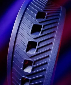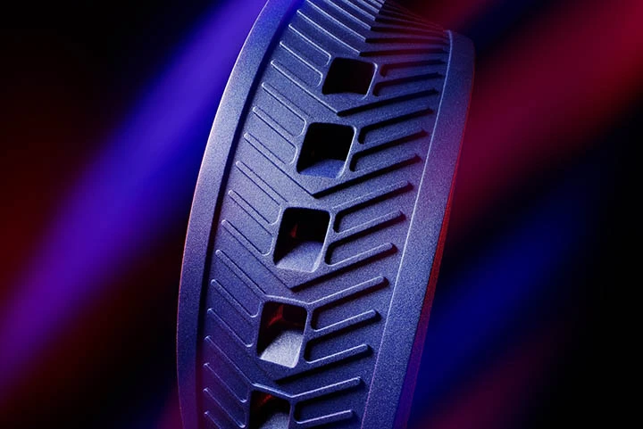 The blue sunray brushed dial with red and yellow highlights, rhodium-plated hands, and hour markers offers surpassing style in all conditions.