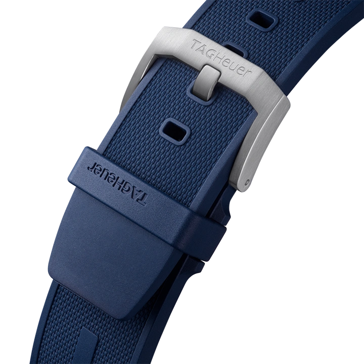 Fitted with a textured blue rubber strap, with TAG Heuer engraved pin buckle, this energetic challenger looks the part.