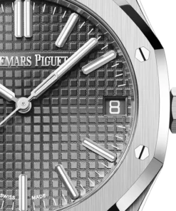 41 mm monochrome Royal Oak Automatic, stainless steel case with dark gray “Grande Tapisserie” dial with new design details.