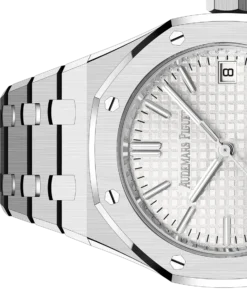 The silver dial is engraved with “Grande Tapisserie” pattern decoration, with white gold applied hour markers and Royal Oak hands with luminescent coating.
